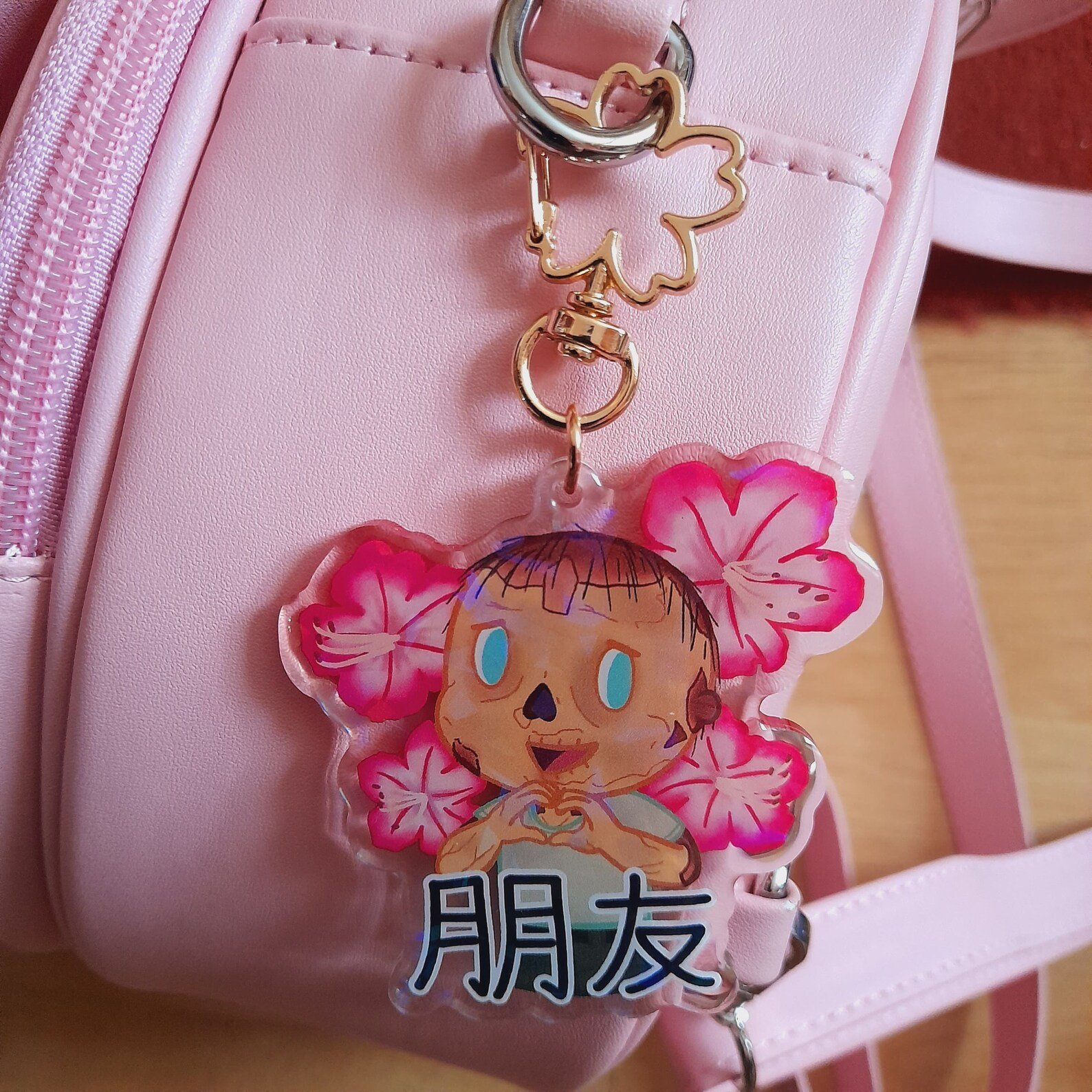 Keyring of our beloved Megaton bartender and saloon owner, Gobtholemew, surrounded by pink rhododendrons and saying "friend" in Cantonese.